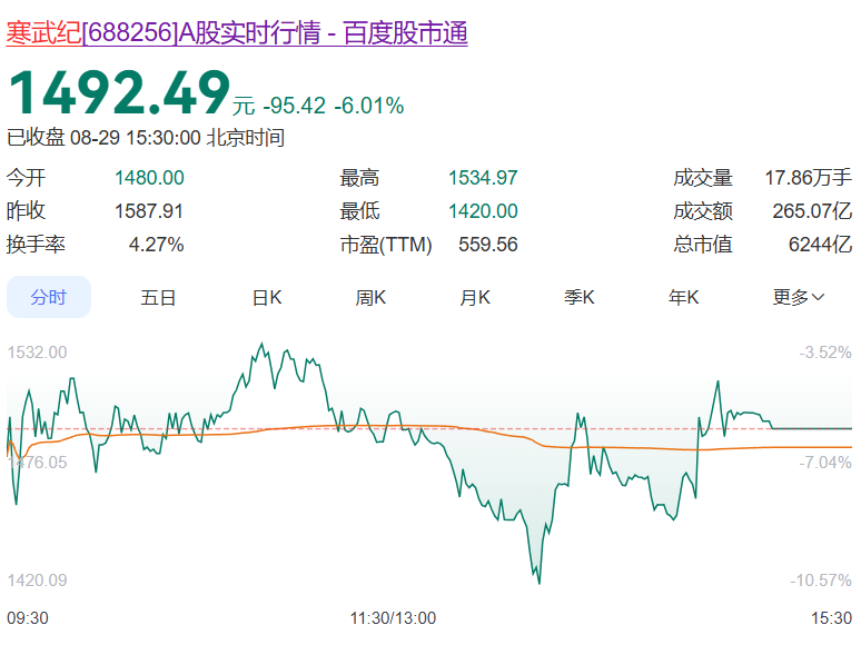 截至29日收盘,寒武纪报收1492.49元/股,较前一日收盘价1587.91元/股,每股跌95.42元。记者注意到,寒武纪28日总市值为6643.03亿元,29日总市值为6244亿元,单日蒸发近400亿元。